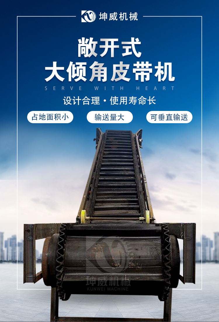 先說一下大 傾角帶式輸送機(jī) 的優(yōu)勢(shì) (1)大傾角帶式輸送機(jī)的輸送傾角大,可達(dá)90,是大傾角輸送和垂直提升的理想設(shè)備。因此可以節(jié)約占地面積,節(jié)省設(shè)備投資和土建費(fèi)用,取得良好